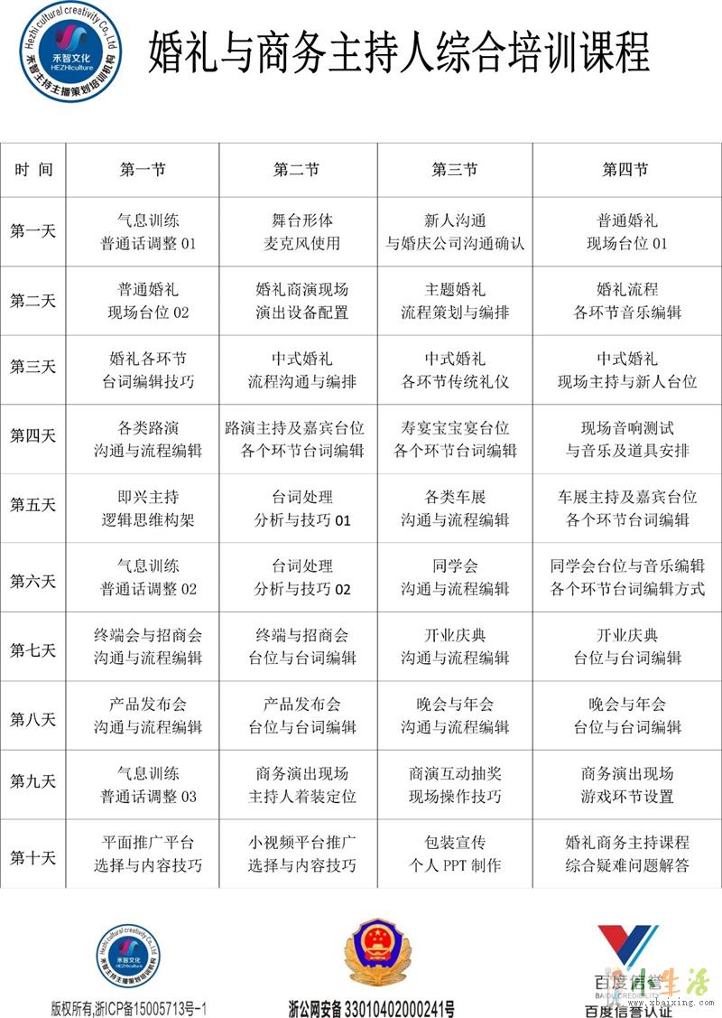 建立客户源等;培训内容:婚礼统筹,婚礼策划(色系与花艺的搭配,新人策划